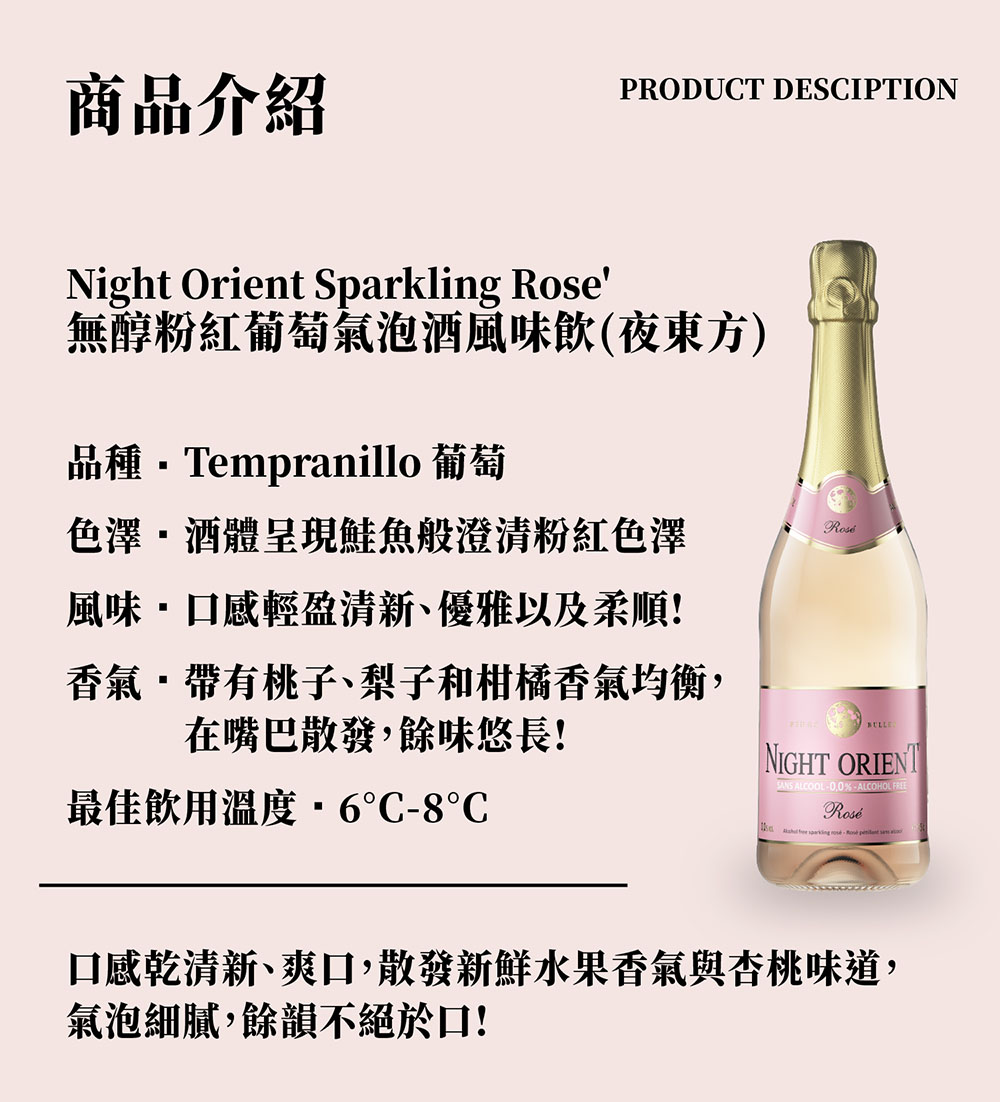 - Night Orient Sparking Rose'無酒精粉紅氣泡酒採用的丹魄葡萄,種植地為西班牙La Mancha地區,經過發酵、窖藏、陳釀,而在裝瓶之前,多了經過特殊工藝脫醇過濾去掉酒精的步驟。