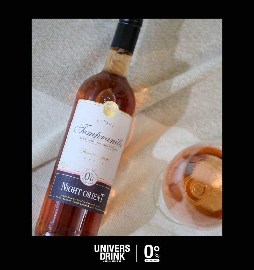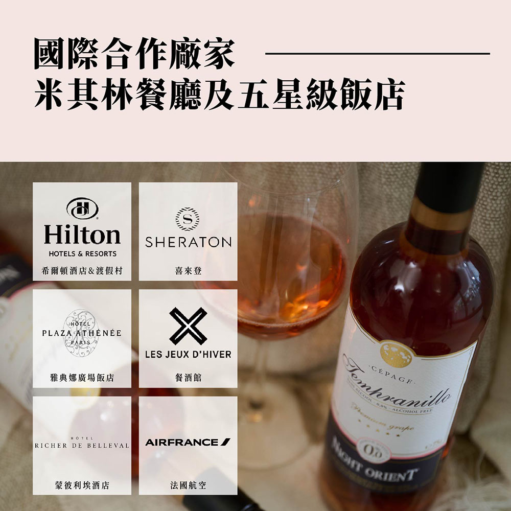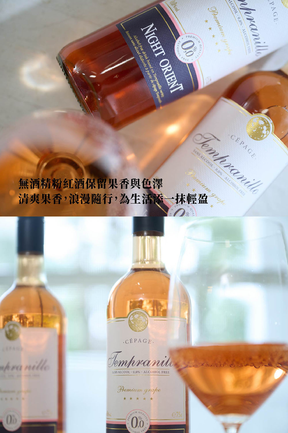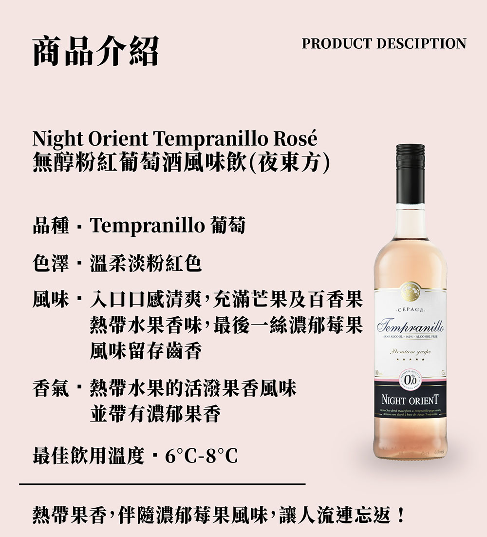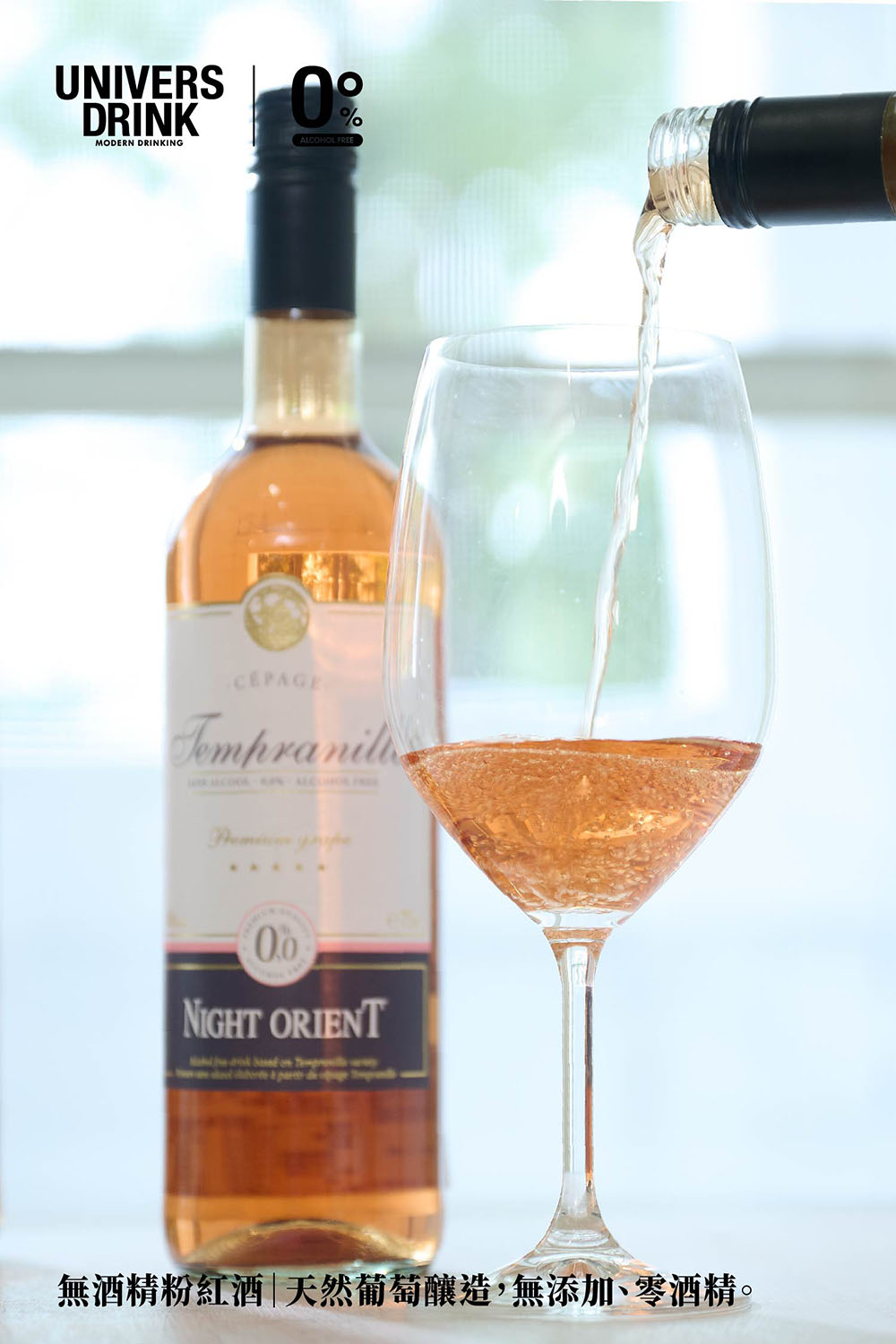 - Night Orient Tempranillo Rosé無酒精粉紅酒採用的Tempranillo 葡萄,經過發酵、窖藏、陳釀,而在裝瓶之前,多了經過特殊工藝脫醇過濾去掉酒精的步驟。