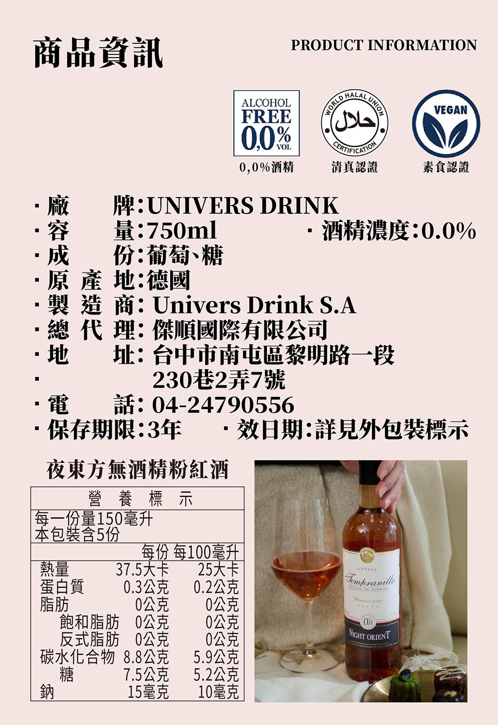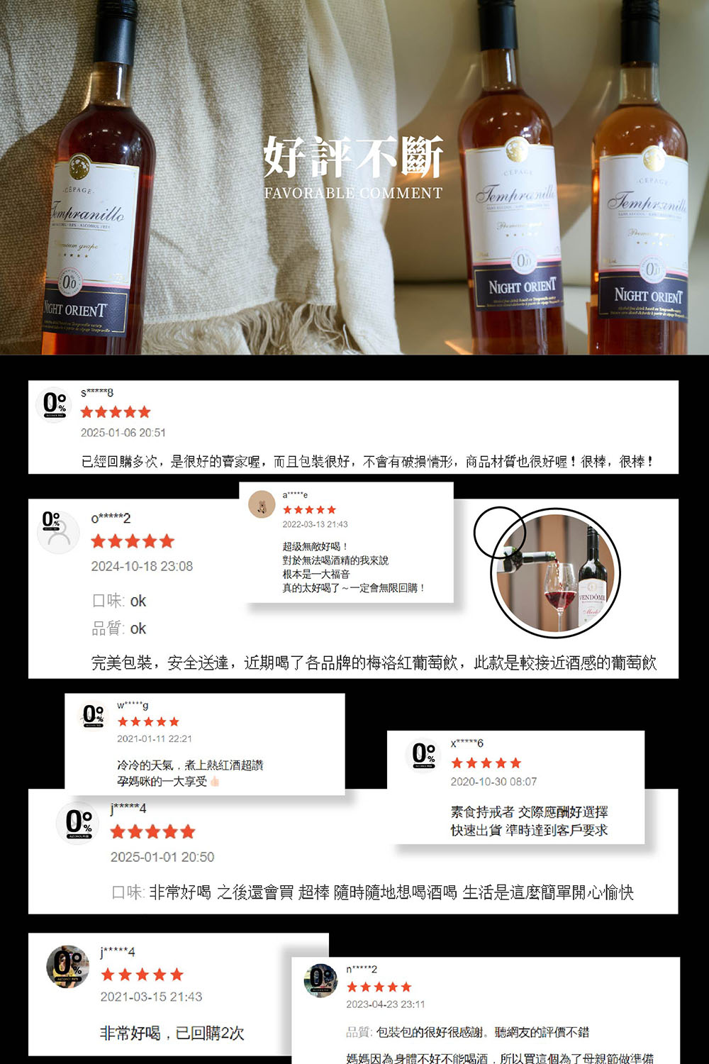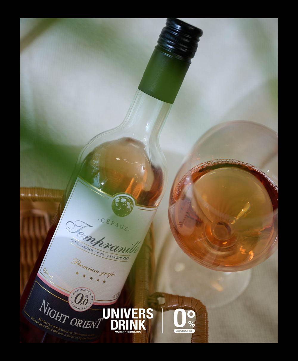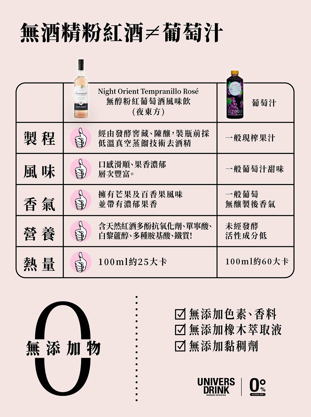 - Night Orient Tempranillo Rosé無酒精粉紅酒採用的Tempranillo 葡萄,經過發酵、窖藏、陳釀,而在裝瓶之前,多了經過特殊工藝脫醇過濾去掉酒精的步驟。