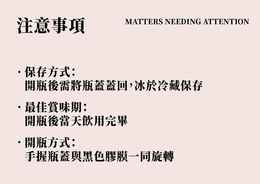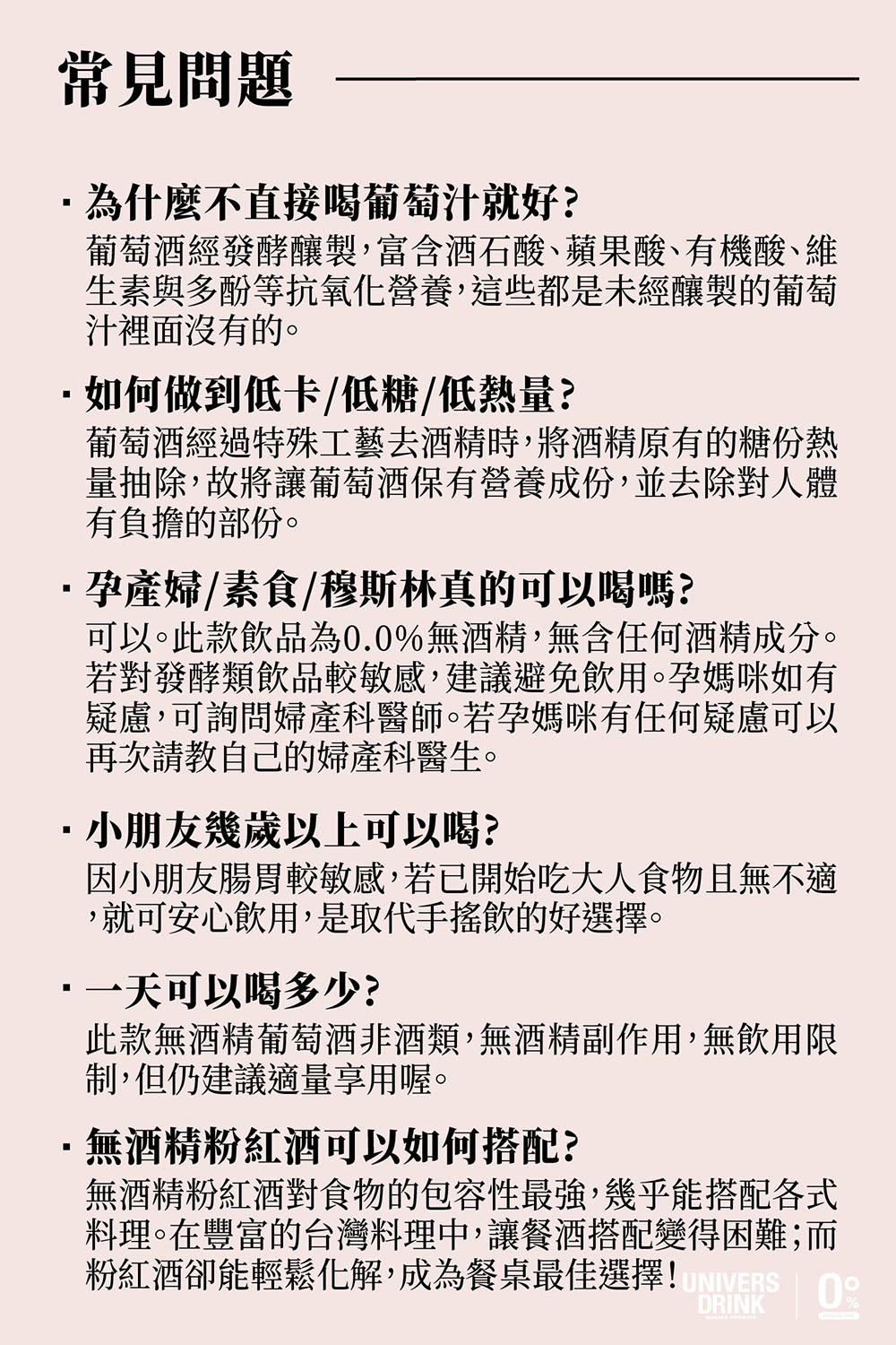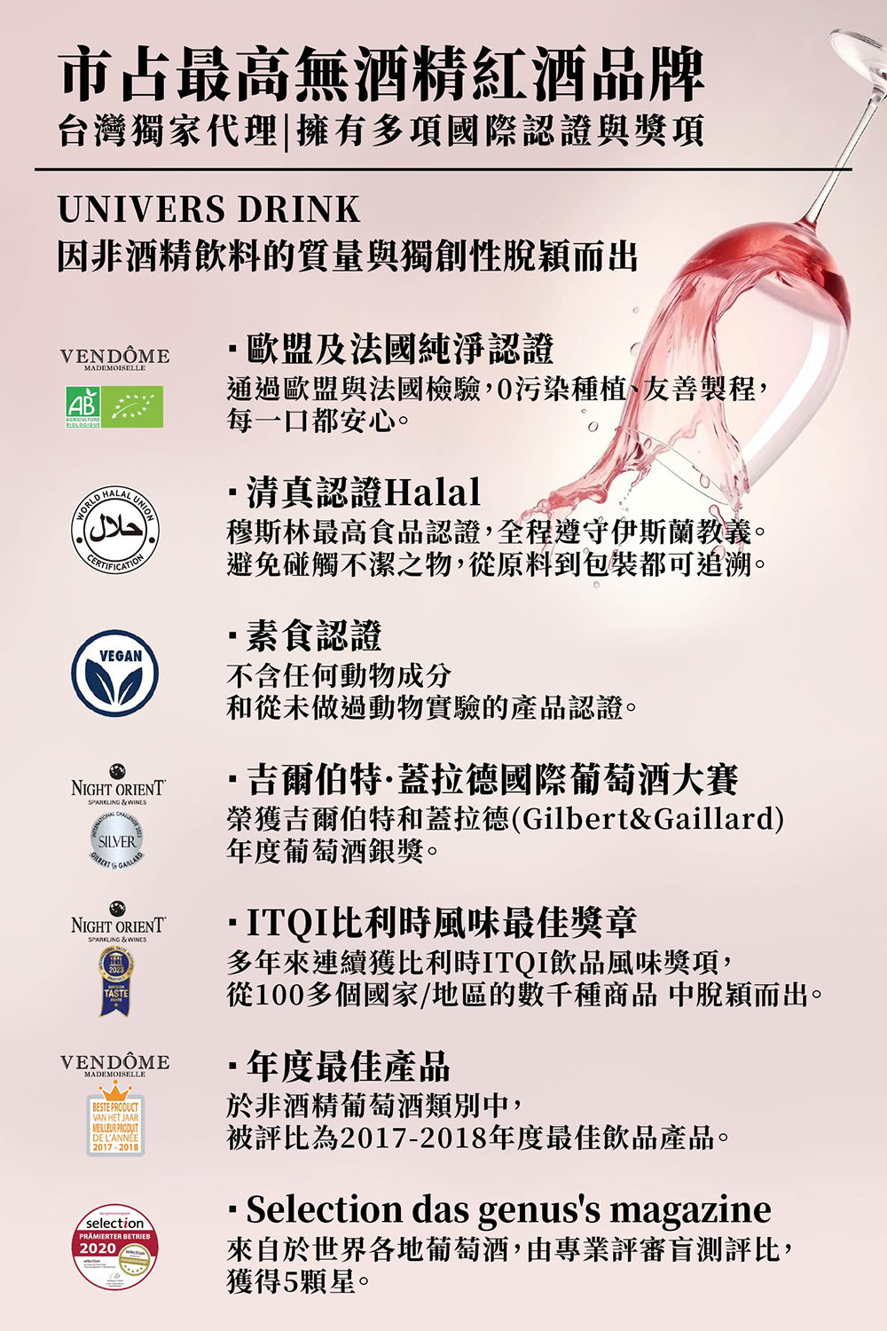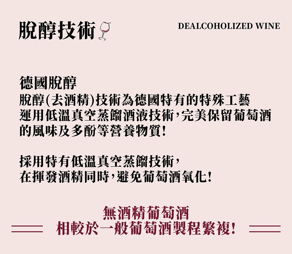 - 孕產婦/小朋友/酒精過敏患者/酒精不耐症等,皆無飲用限制,是一款非常適合海鮮及及搭配甜點飲品。