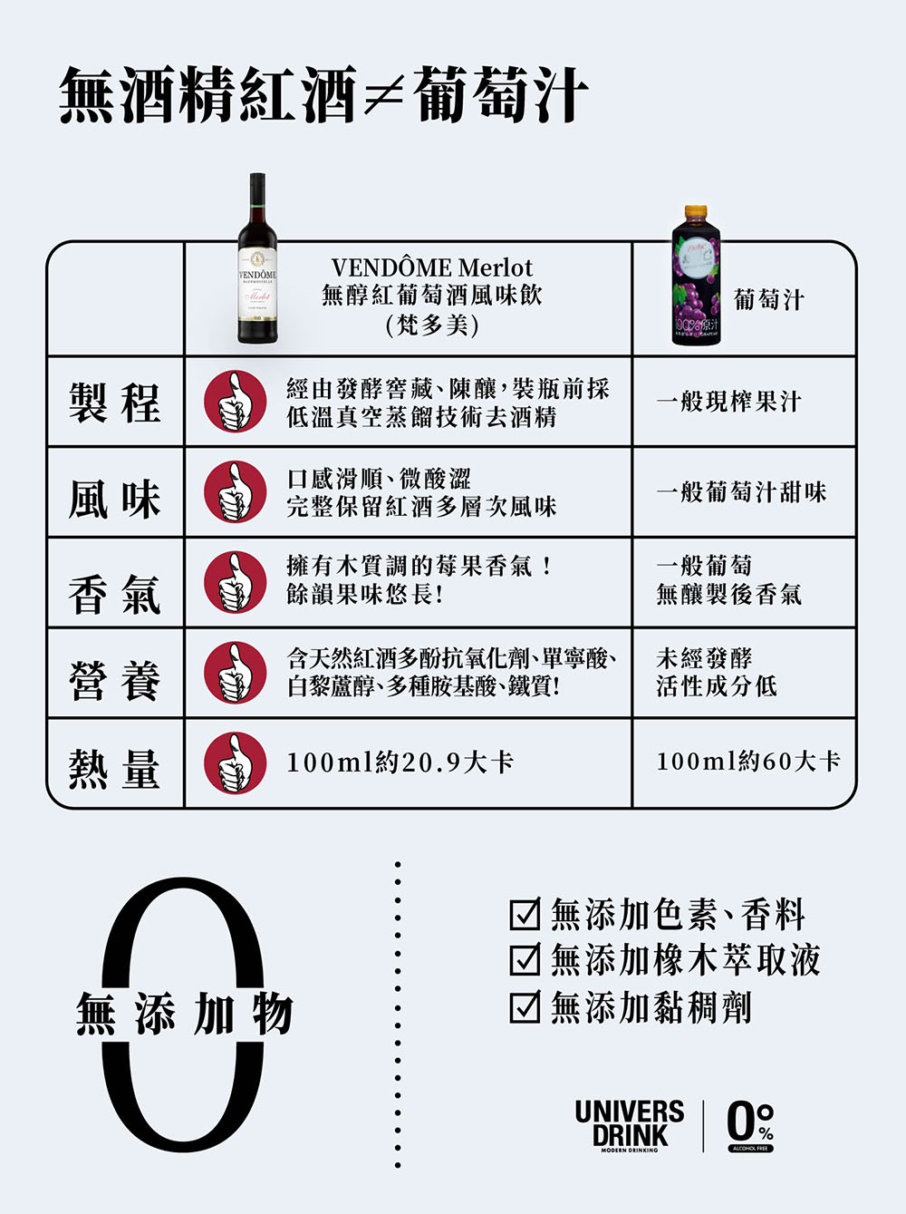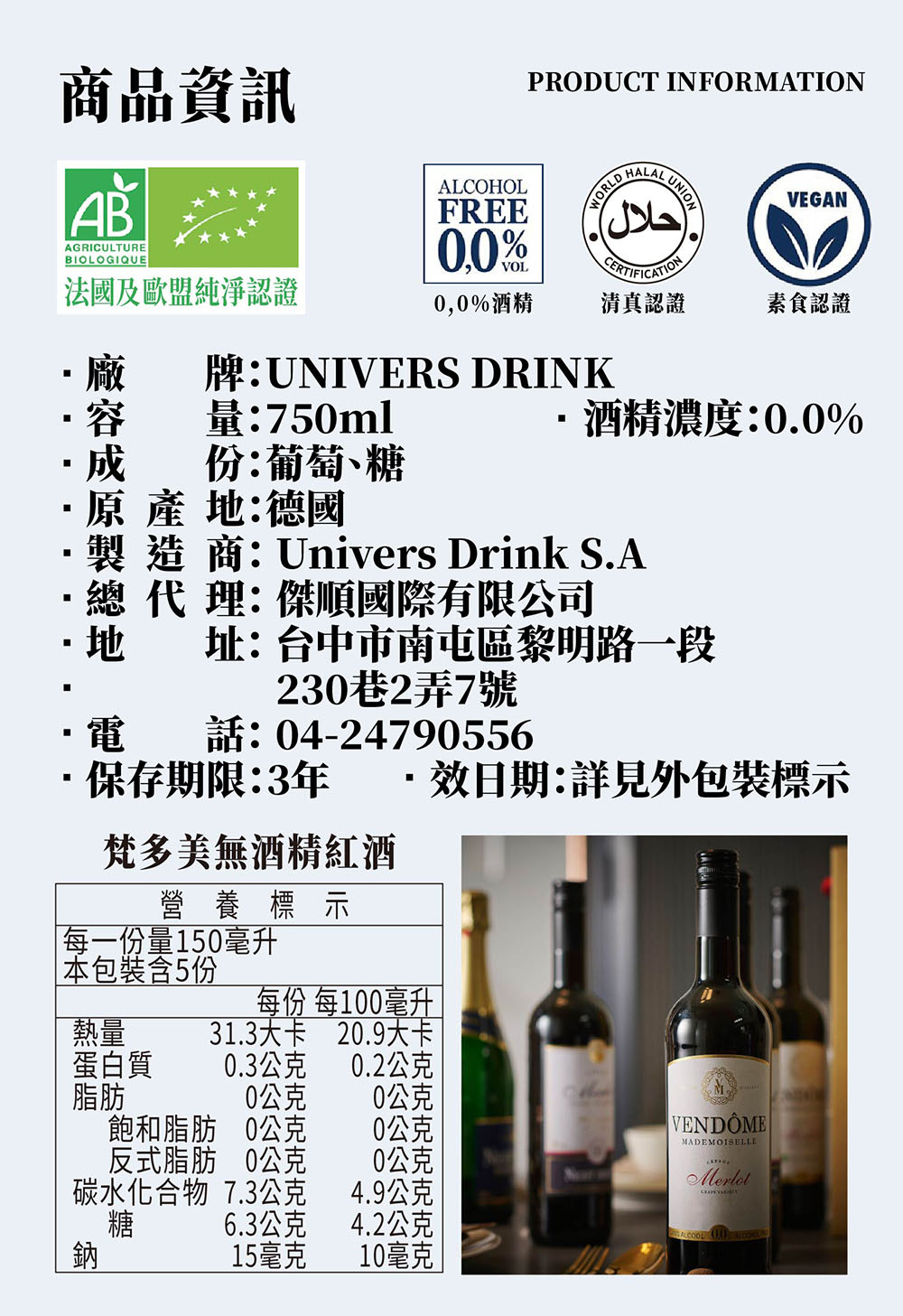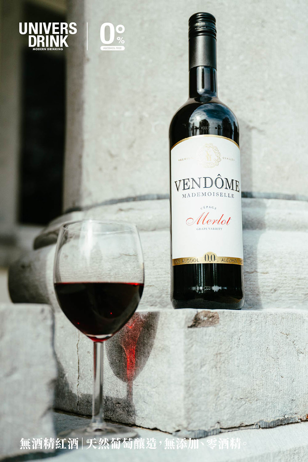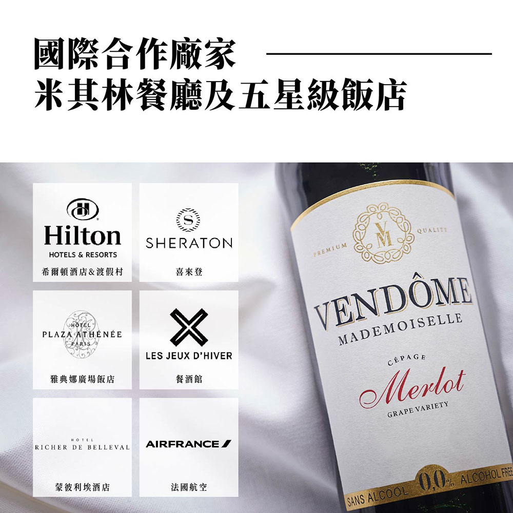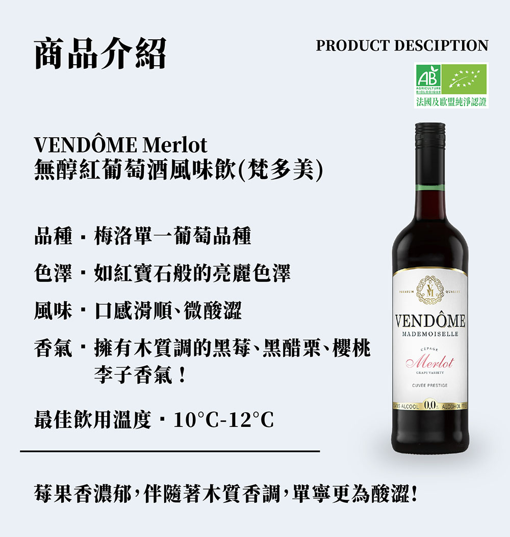 - VENDOME Merlot來自未使用化學肥料土地自然耕種梅洛葡萄釀製成的無酒精紅酒!未使用化學藥劑潔凈製成,糖份,熱量再更低!擁有歐盟及法國認證。