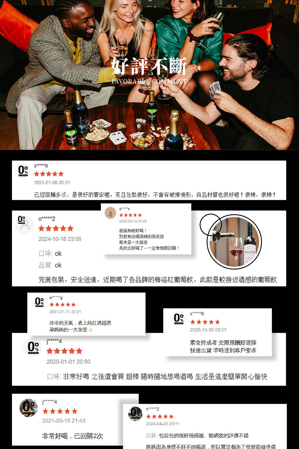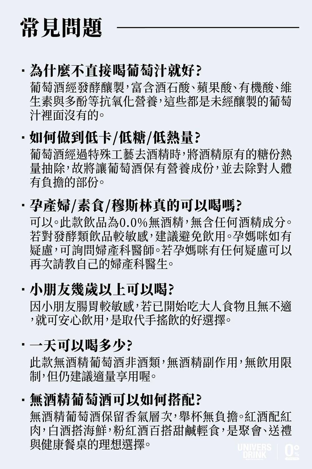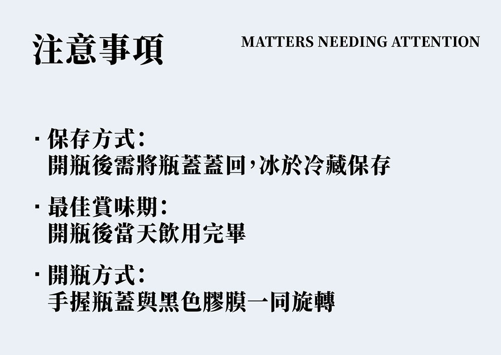 - 孕產婦/小朋友/酒精過敏患者/酒精不耐症等,皆無飲用限制,更適合於烹飪餐點時加入,也能搭配任何餐點食用。